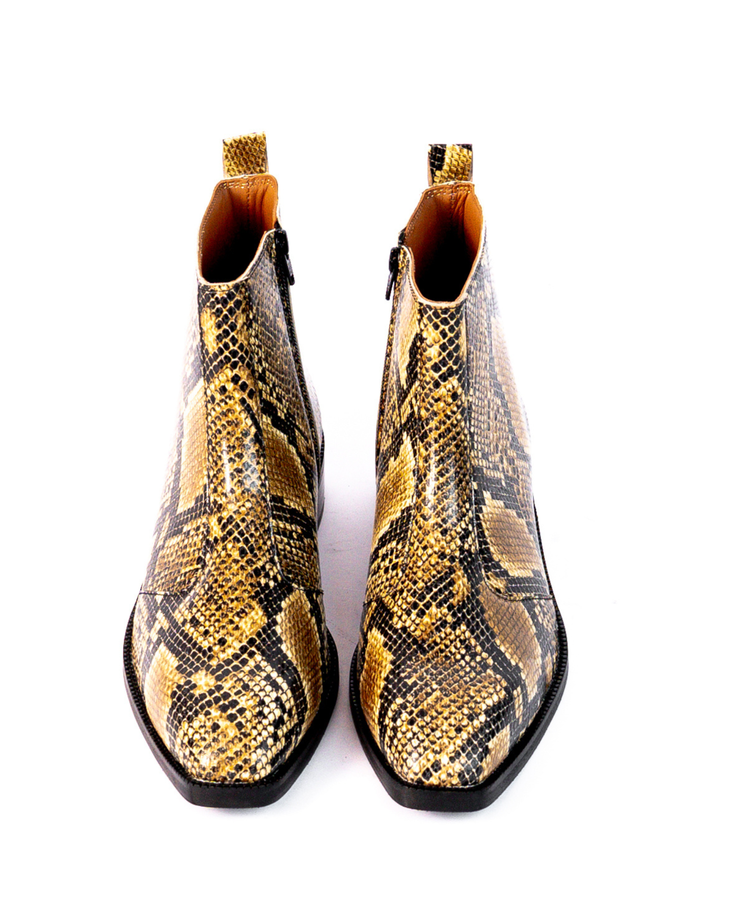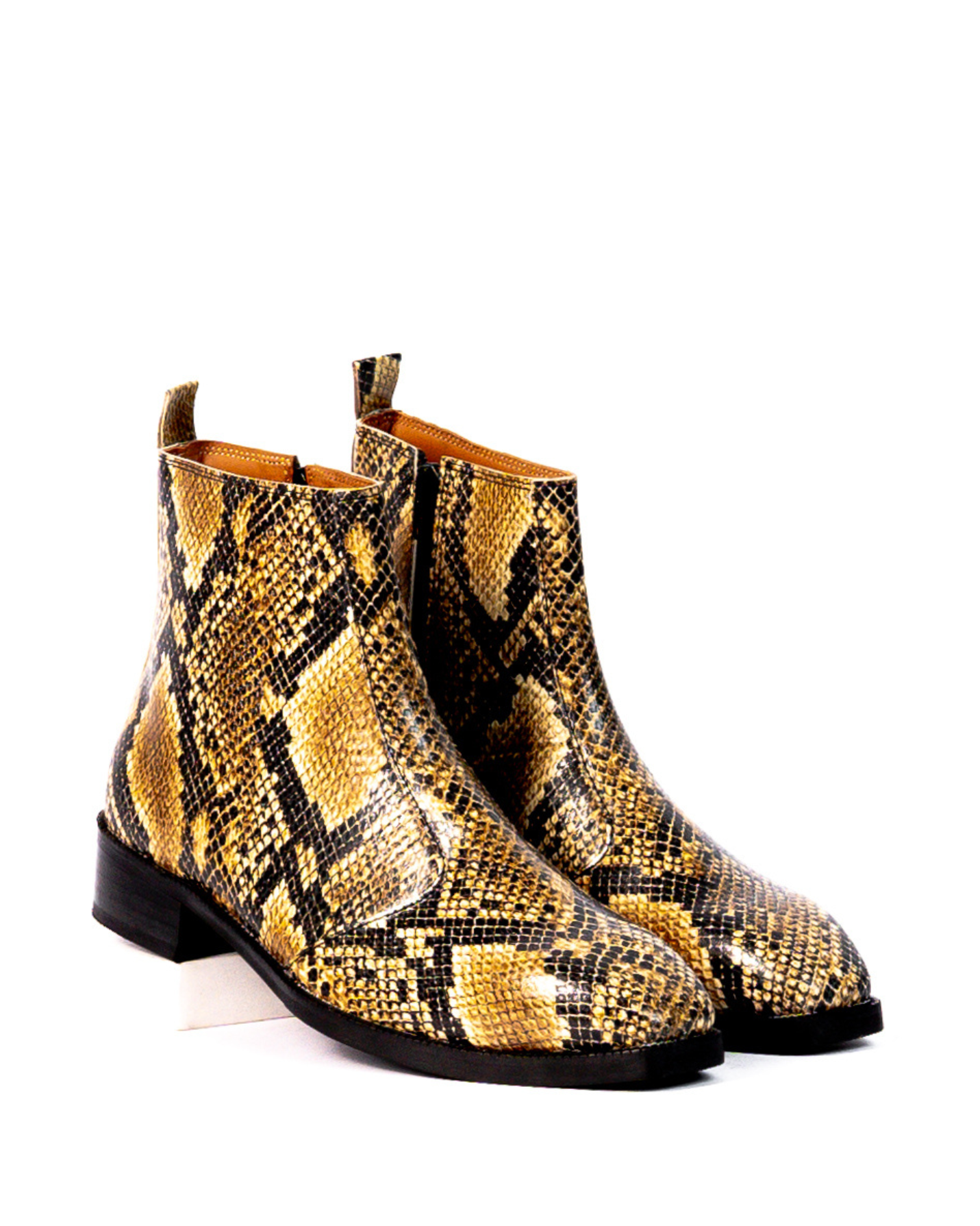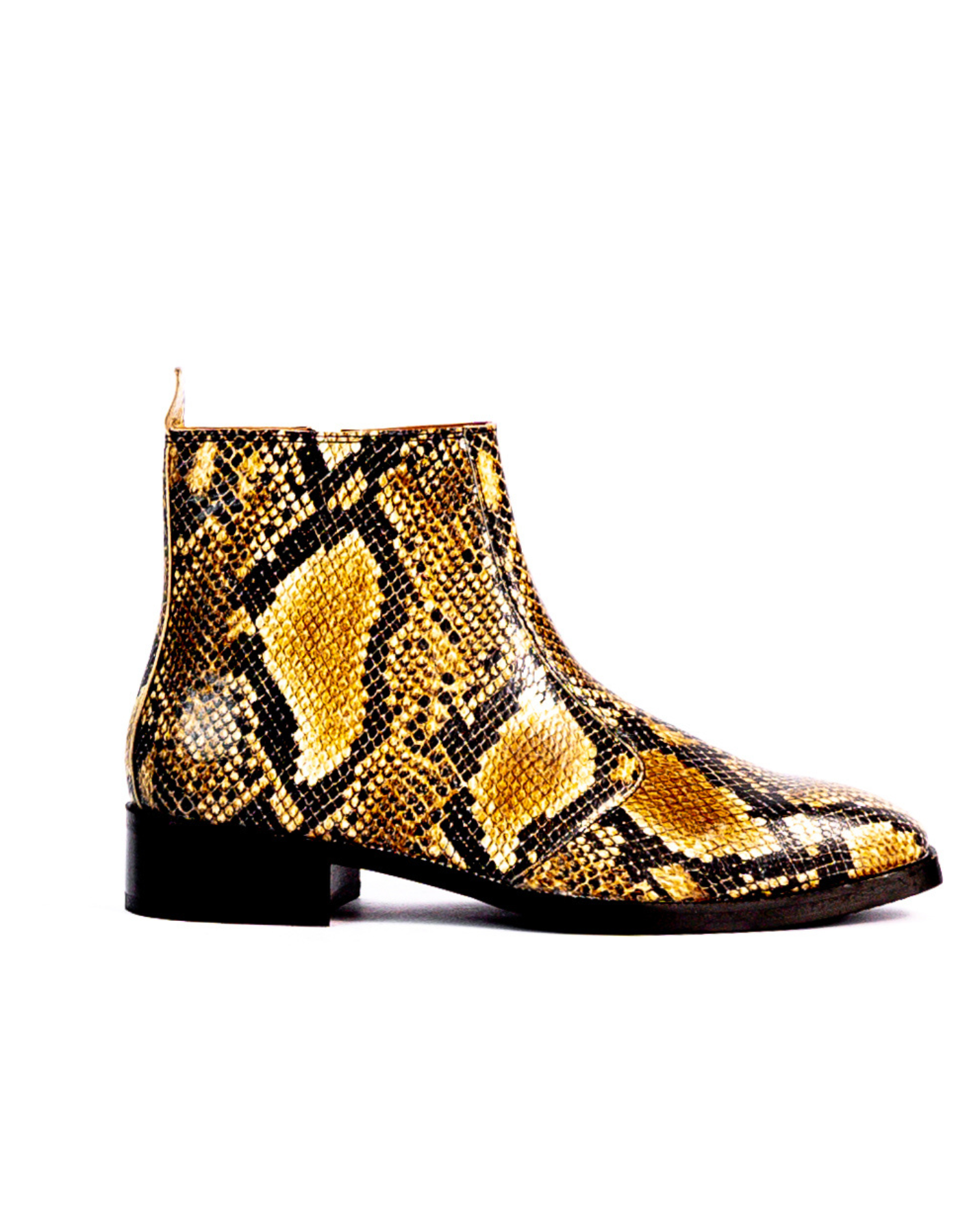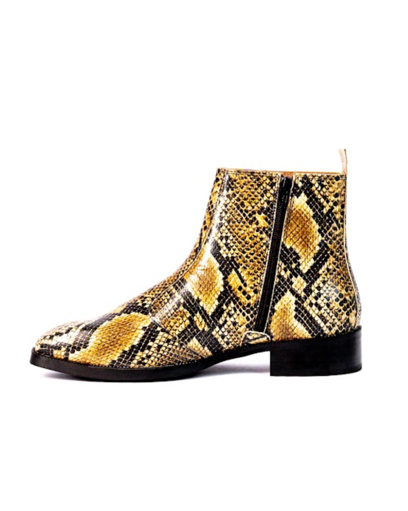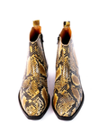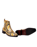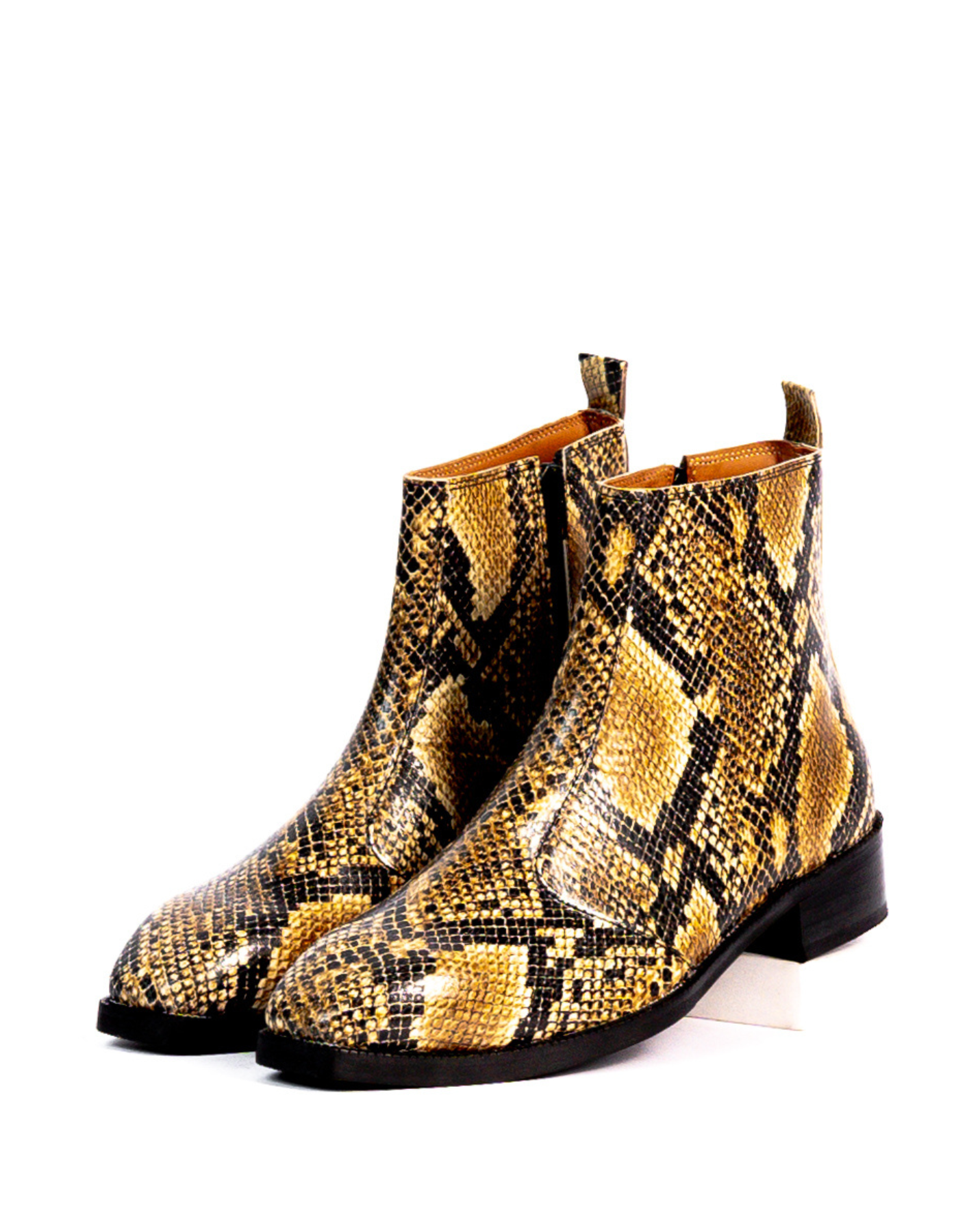 Bold yet balanced — these snake-textured Chelsea boots channel the raw beauty of the desert. With a sculpted form, elastic panels, and hand-polished tones of gold and brown, they command attention without saying a word.