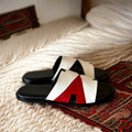 Bold geometry meets minimal design in this pair of handcrafted leather slides. Defined by sharp color-blocked panels in black, white, and brick red, these slides strike a balance between art and everyday comfort. Each piece is cut and assembled with precision, creating a wearable form of modern architecture for your feet.