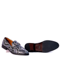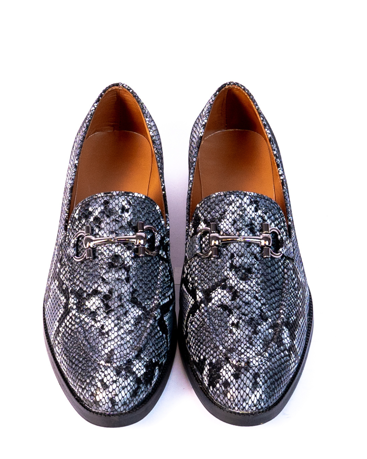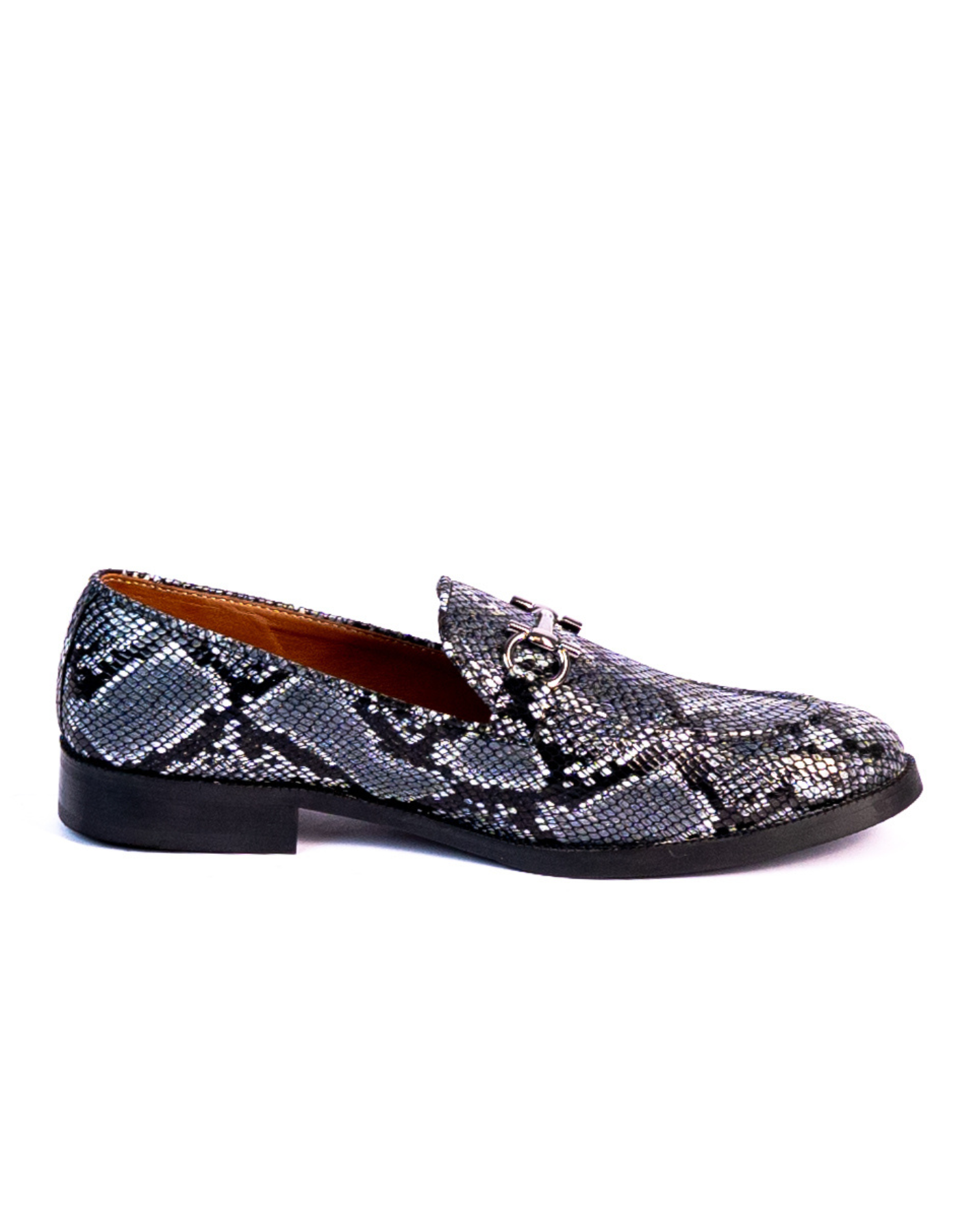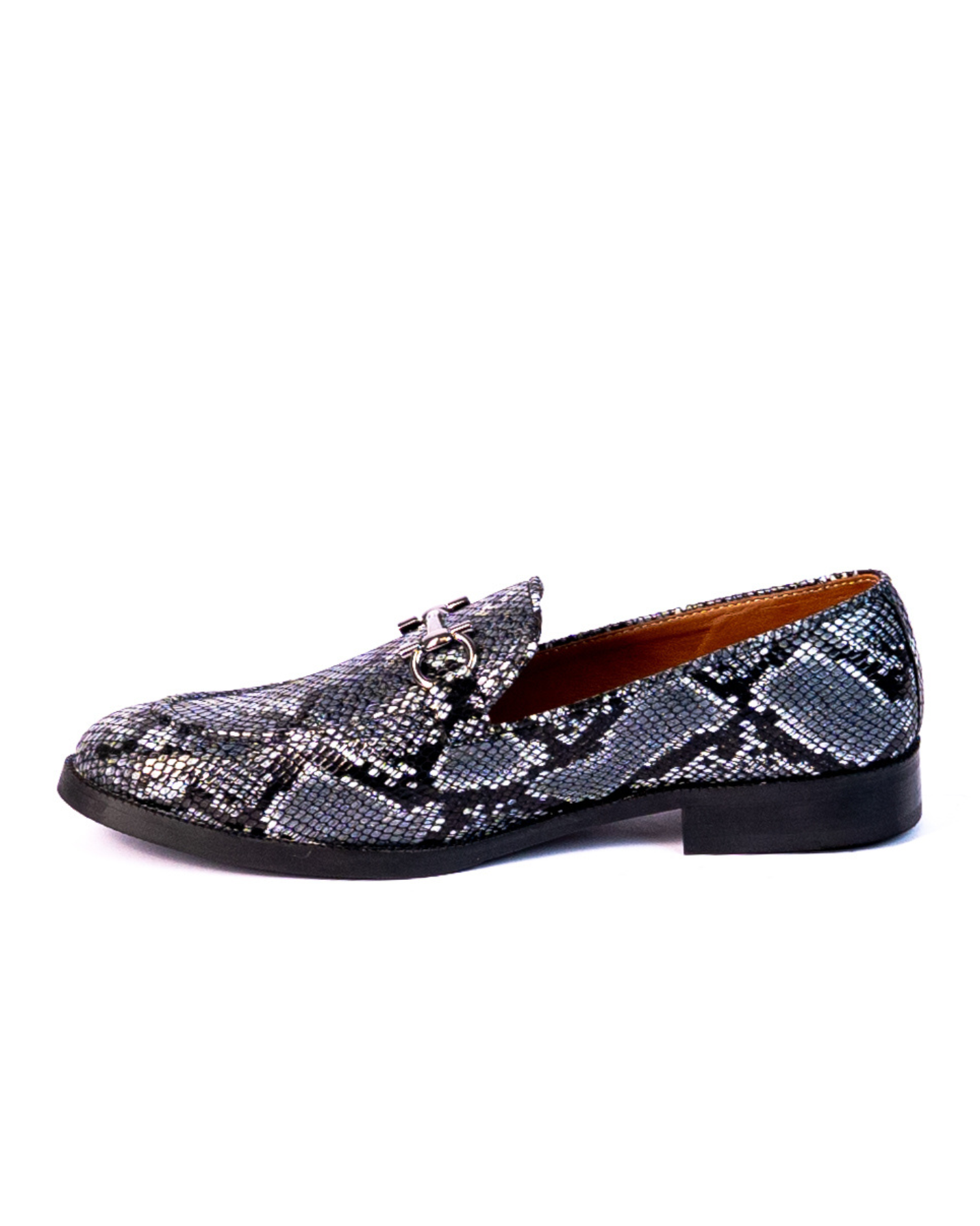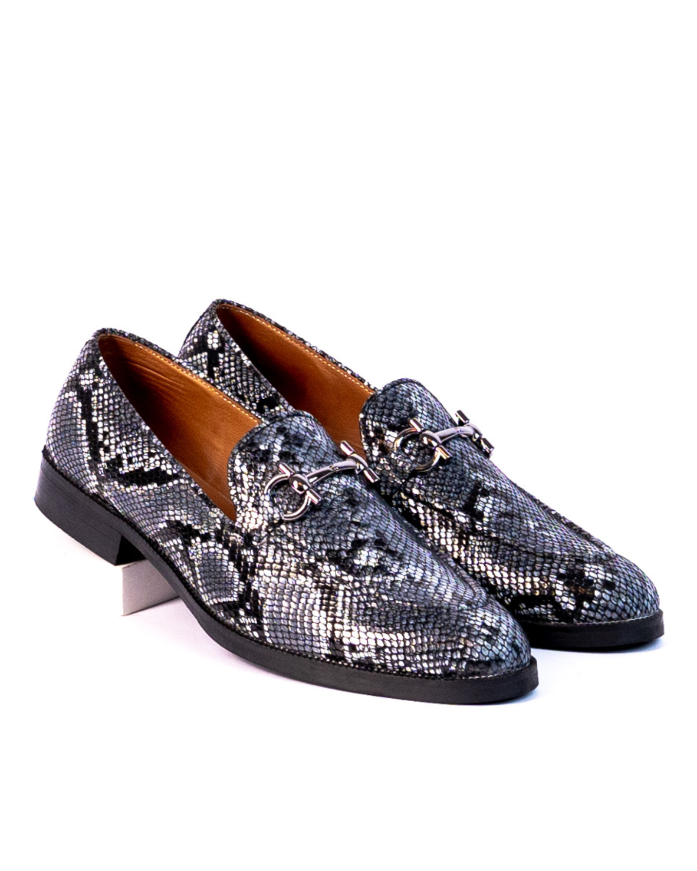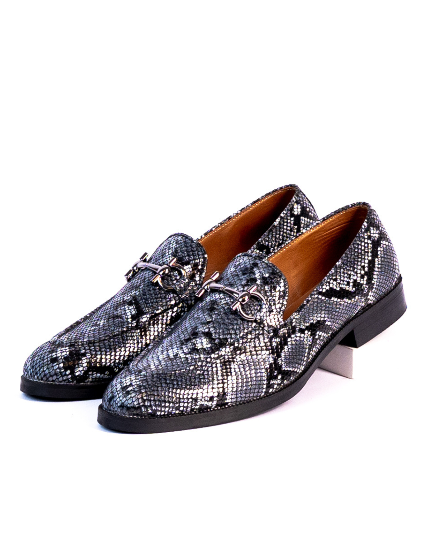 Where polish meets power. The Noir Crest loafers are cut from high-shine croc-textured leather and finished with a gleaming metal bit. A piece that commands attention quietly — timeless, grounded, and built to endure.