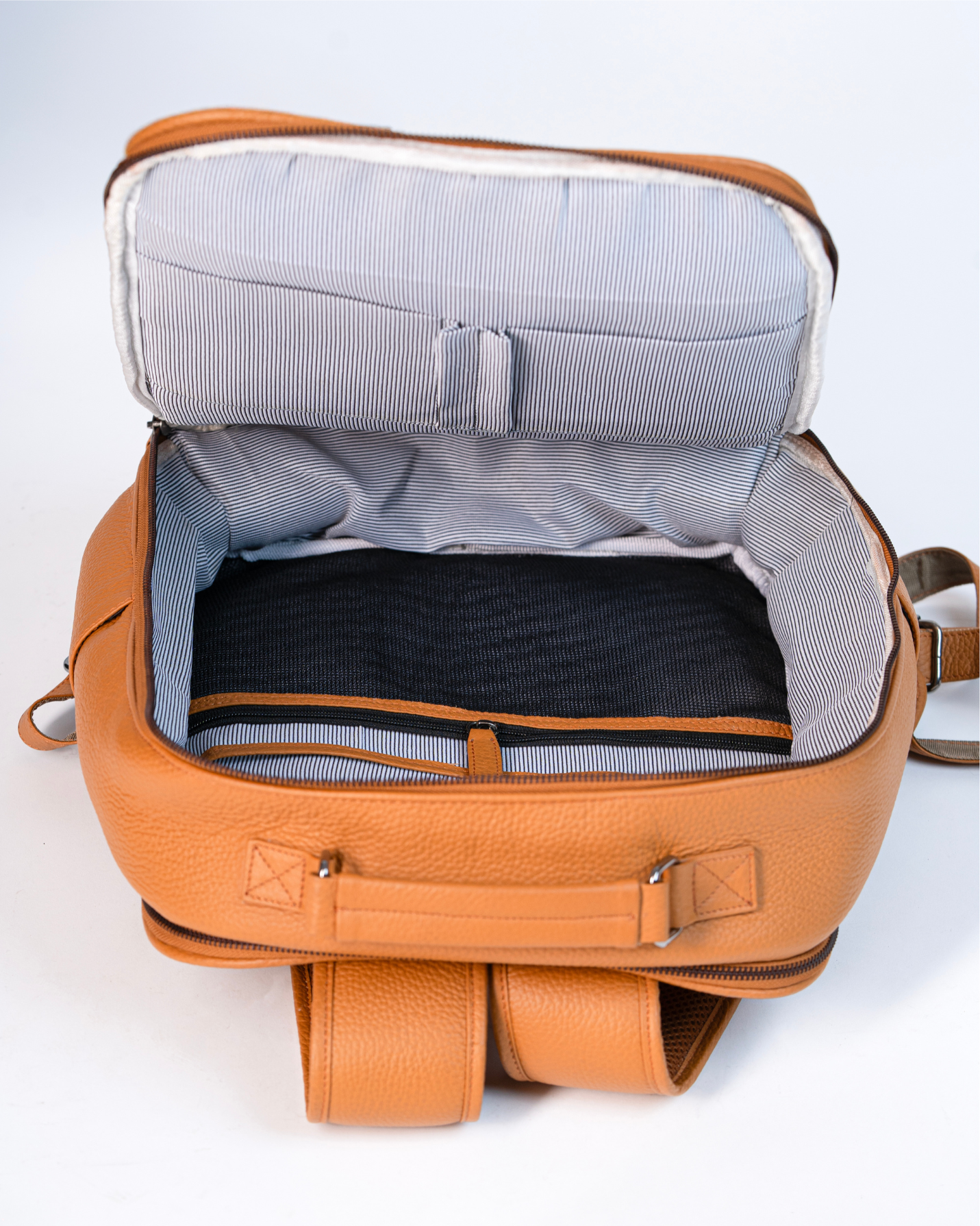 Sol Tanaro carries the essence of effortless sophistication — a companion shaped by craftsmanship and purpose. Made from full-grain tan leather, its clean lines and structured form echo subtle confidence. Every panel is thoughtfully stitched to create harmony between design and function, while the deep grain and soft sheen remind you of leather in its purest form.