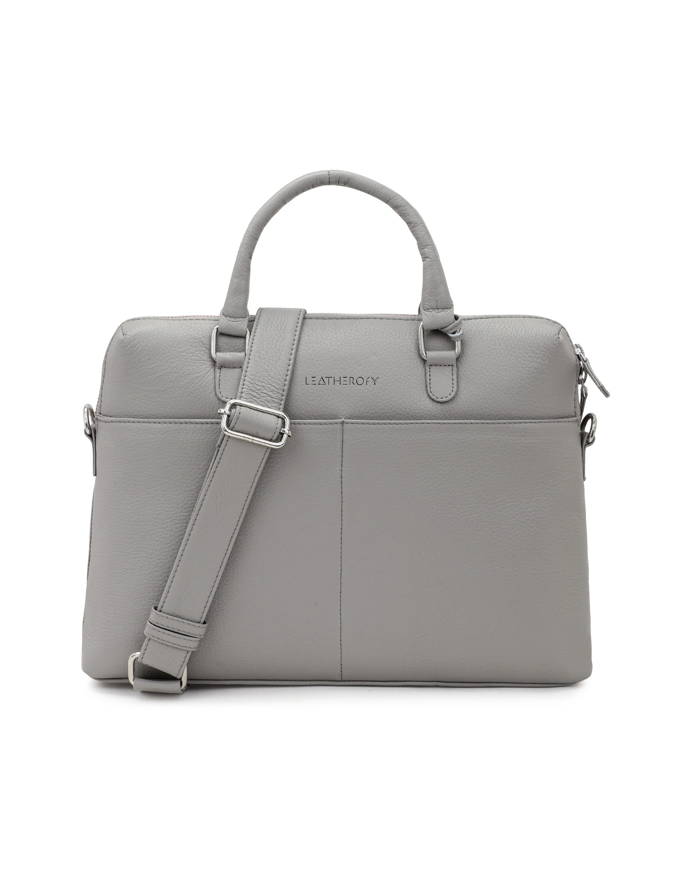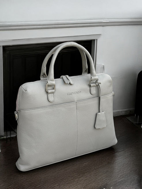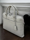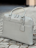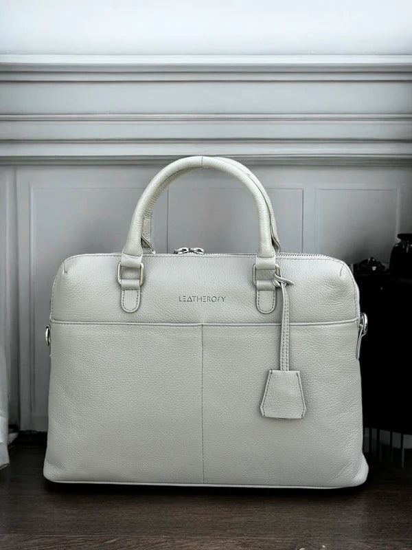 This sleek off-white leather laptop bag combines style and function. With a structured design, secure zip closure, and spacious interior, it's perfect for carrying your laptop and essentials in style.