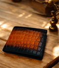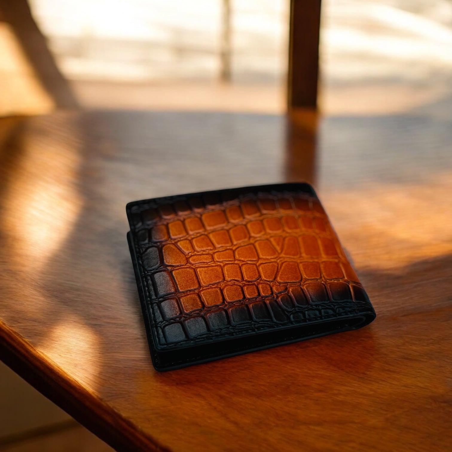 Crafted for the discerning minimalist, the Emberfold wallet tells a story of earth and fire. Its hand-burnished croc-embossed leather fades from deep black into rich amber, echoing the warmth of slow craftsmanship and deliberate detail.